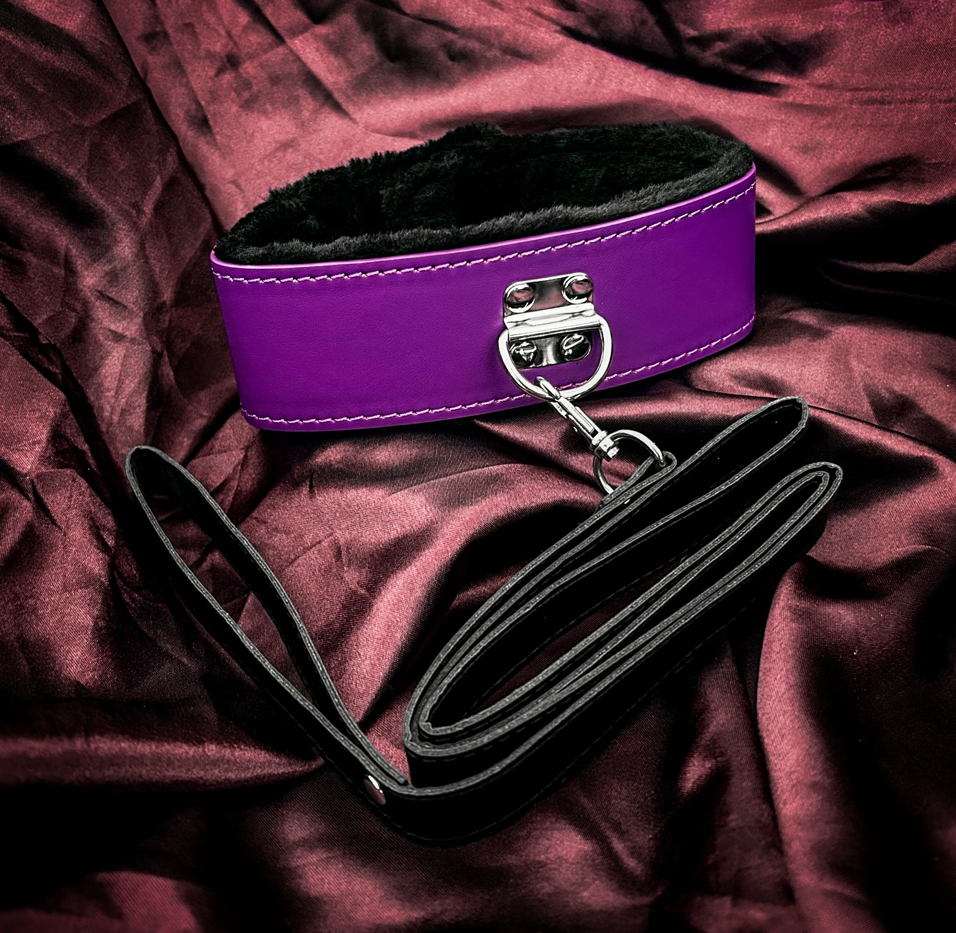 Collier noir doublé de fourrure avec laisse détachable. Confortable, élégant et ajustable, parfait pour des jeux de domination sensuelle et raffinée.